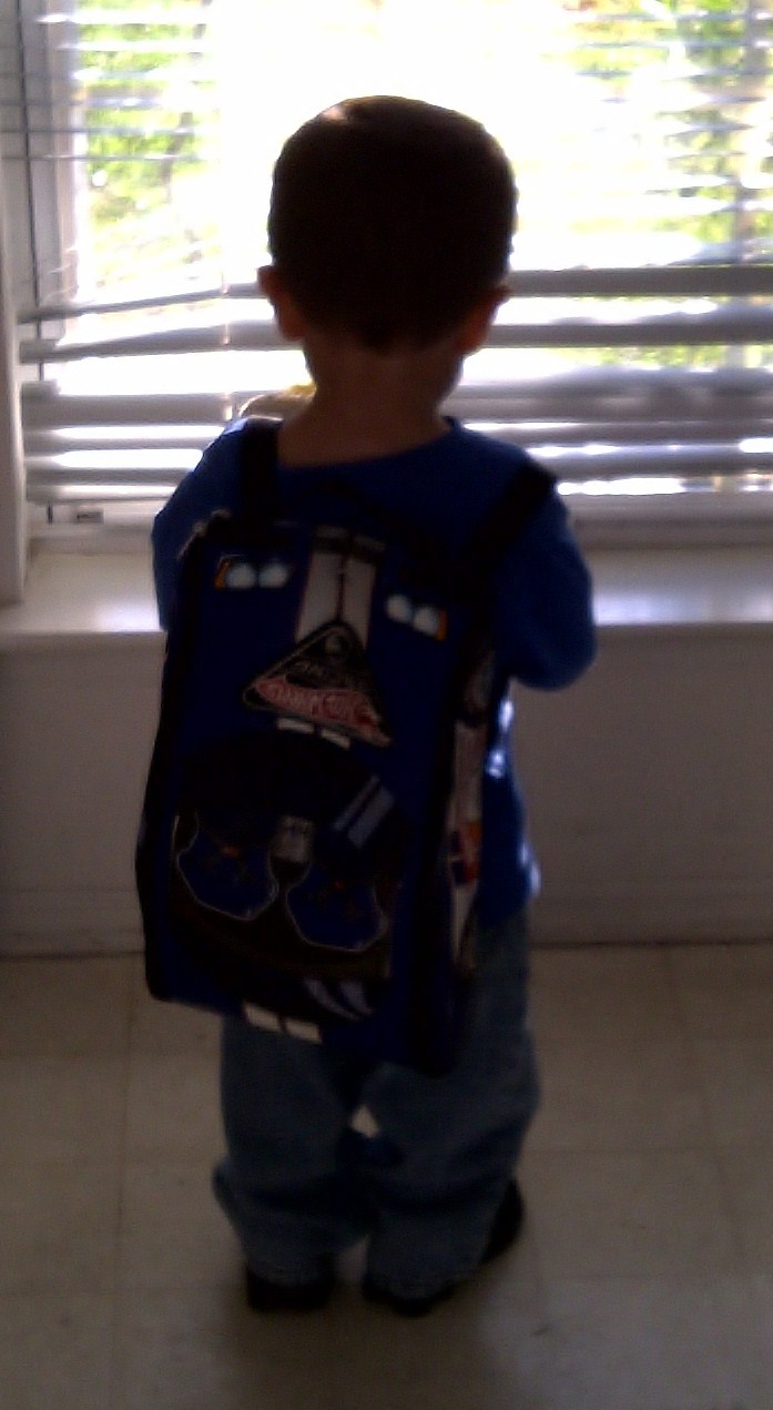 Ayden is almost 27 months old and has been obsessed with cars and trucks since shortly after his first birthday! Oh who am i kidding…as soon as he was able to sit himself up and push anything with wheels back and forth he has been obsessed. Well our little guy has so many Hot Wheels cars these days that were spread ALL over the house so hubby and I finally decided to do something about it. On our venture to Toys R Us last week we found a really neat Hot Wheels carrying case that is a back pack and he just loves it. It works out perfectly too because it holds all of his cars he has and knows when him and his brother are finished playing with them they need to go back in his back pack. The only problem is we haven’t been able to get him to take the back pack off! Here he is with it!