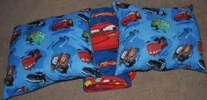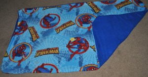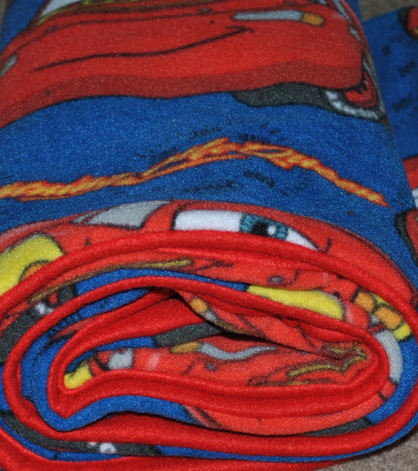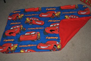 After making Aaron’s car seat cover last night and feeling so accomplished I decided to sit down this afternoon ~while our oldest was in preschool~ and make Angel and Ayden’s new blankets for their toddler beds. When Angel originally got his toddler bed (nearly 2 years ago) we bought him a sheet set that had a cars and fire truck pattern. Needless to say 2 years later the comforter is dunzo… there is absolutely no life left in it, and he’s not into cars or trucks anymore! So at my last trip to Joann’s I picked up fleece material to make my oldest two boys new comforters. Angel was with me and he picked out his own Spiderman material and I picked out Ayden’s Cars pattern because he is still OBSESSED with cars! I paired each fabric with solid fleece to match on the reverse side! I think they turned out great and were super duper easy to make 🙂 Enjoy!