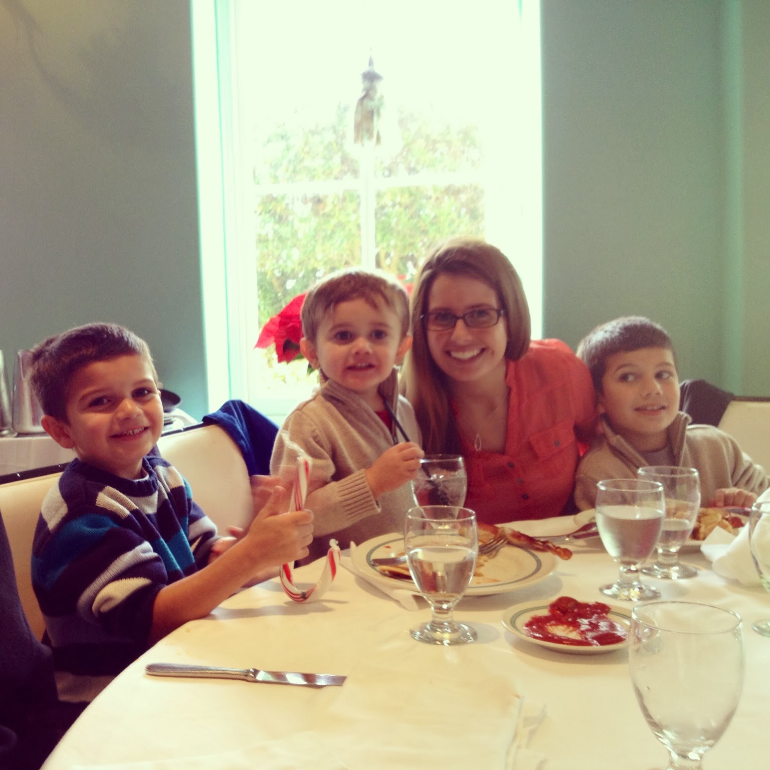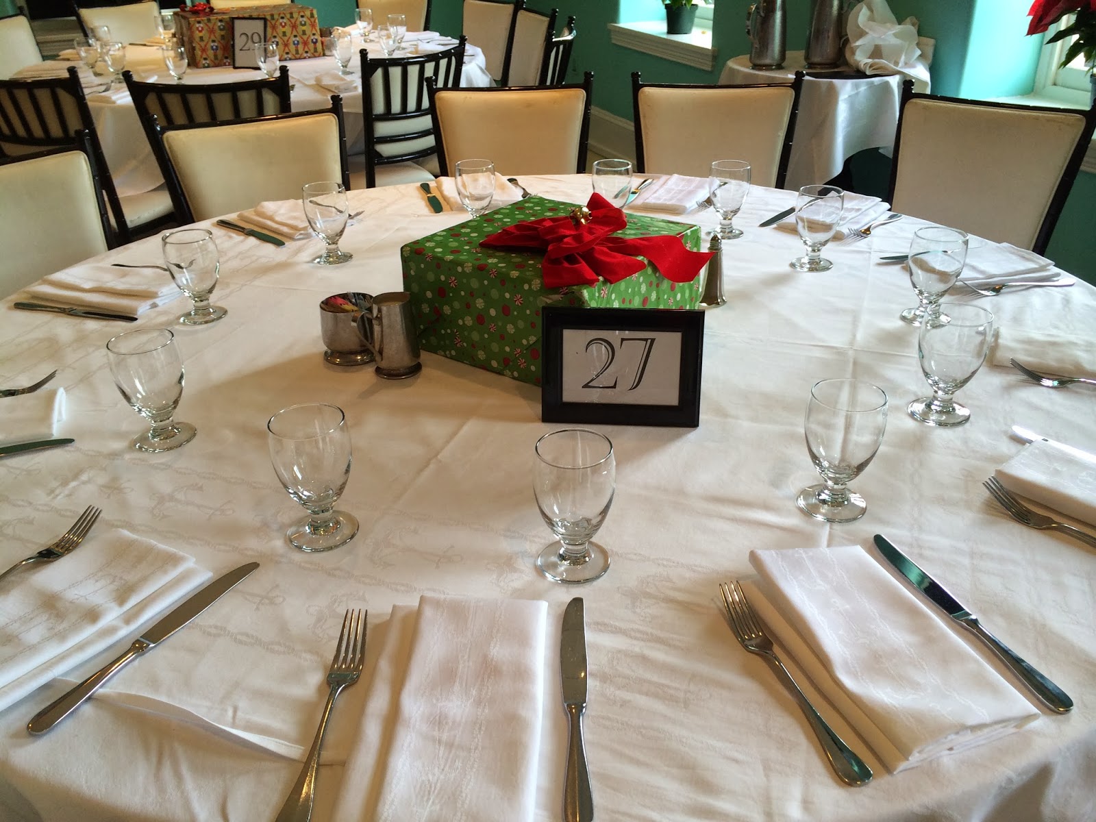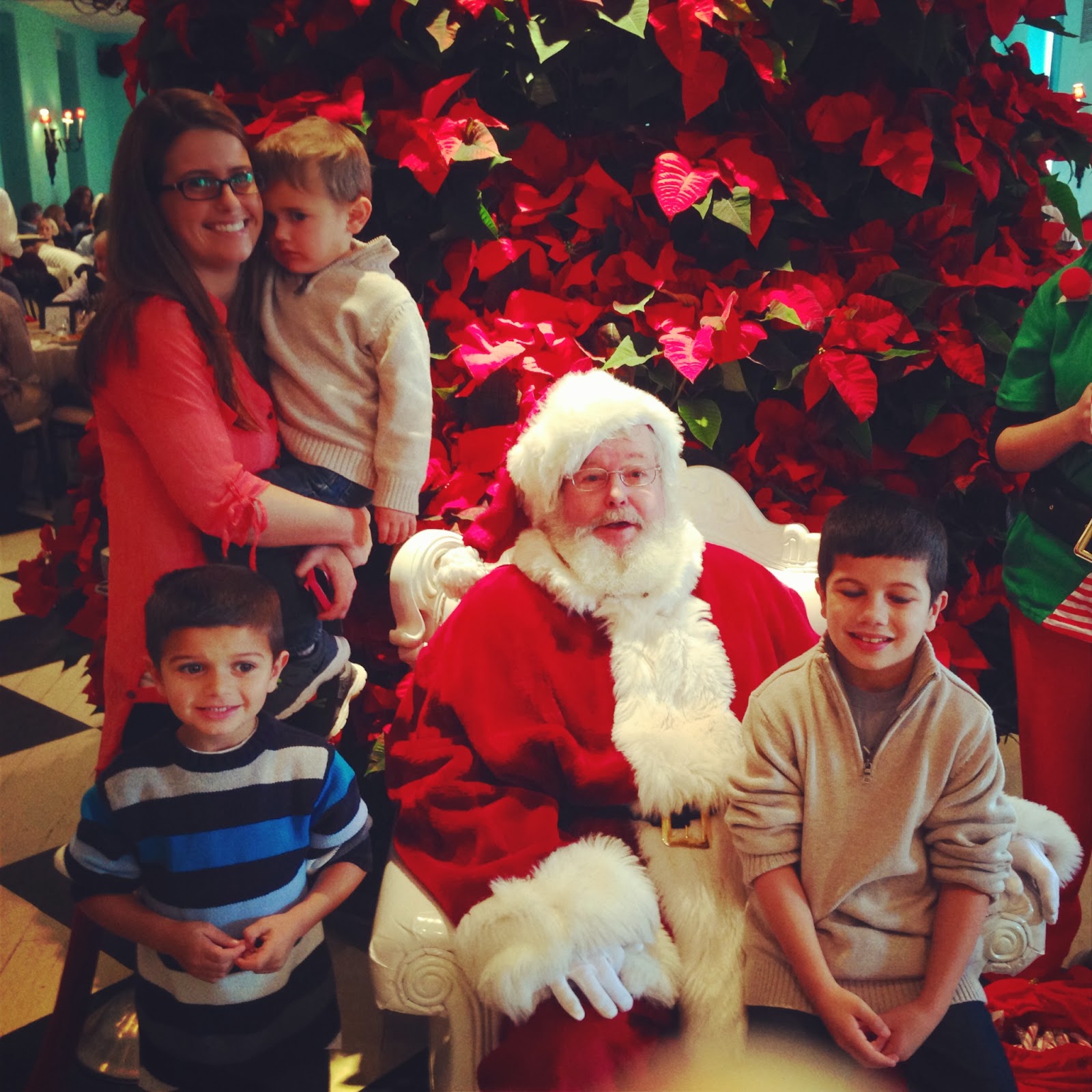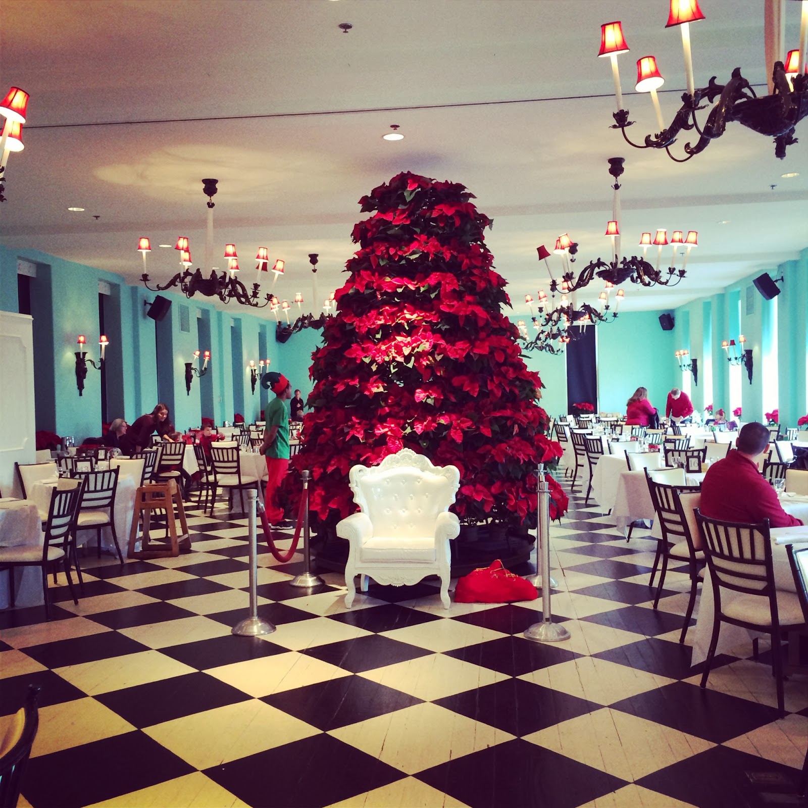 The teal colored walls, extravagant chandeliers, and black and white checkered ballroom floor were an amazing backdrop for the enormous poinsettia Christmas tree fixed in the center of the room where Santa himself was seated!